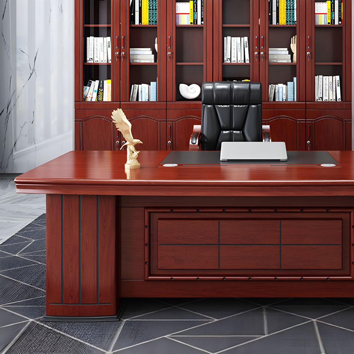 this premium manager desk includes an integrated side return for seamless storage, making it the perfect centerpiece for a professional director’s suite.