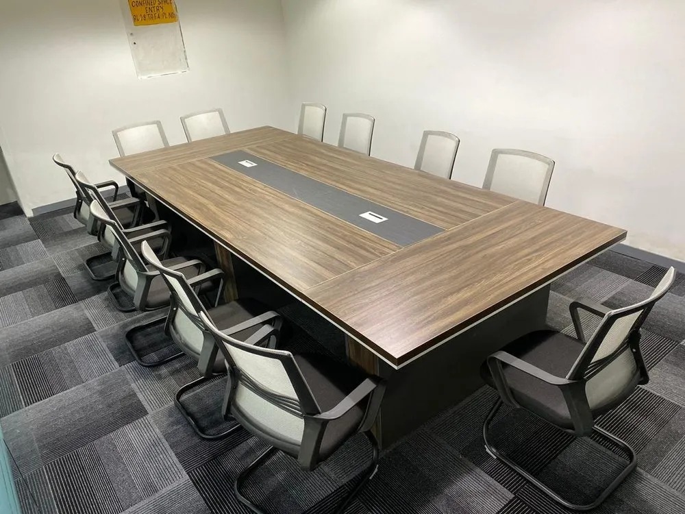 This meeting table has been engineered with a thick wood base for strength and stability. This 12-14 seater table supports presentations and discussions and provides room for 6-8 coworkers with laptops and paperwork.